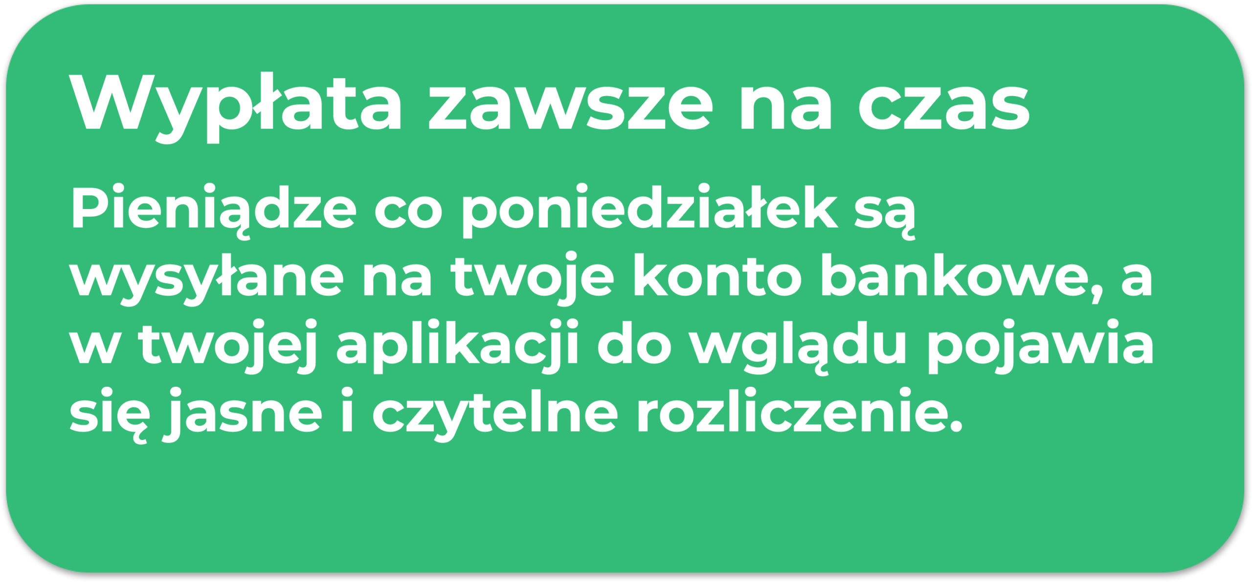 Wypłaty są wysyłane w każdy poniedziałek! Możesz na spokojnie planować i mieć pod kontrolą swoje finanse. Jeśli posiadasz konto w mBanku wypłatę dostaniesz tego samego dnia.
