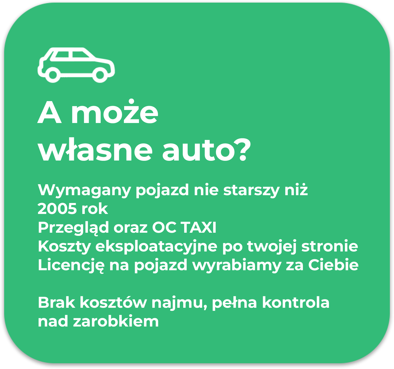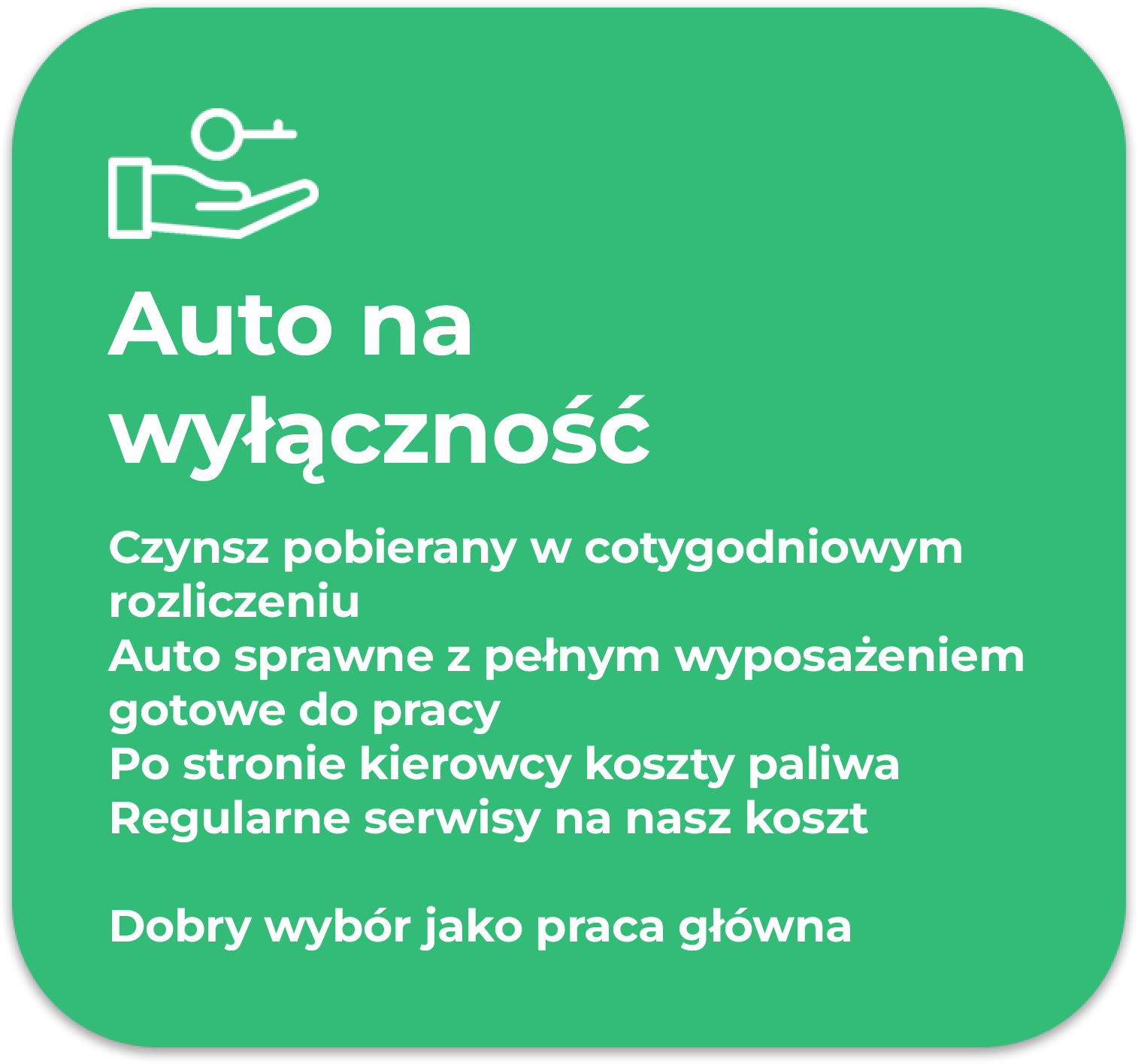 Nie! Nasza flota posiada szeroki wybór aut w pełni przygotowane do pracy oraz różne modele współpracy. Dlatego nie musisz martwić się o własny samochód!